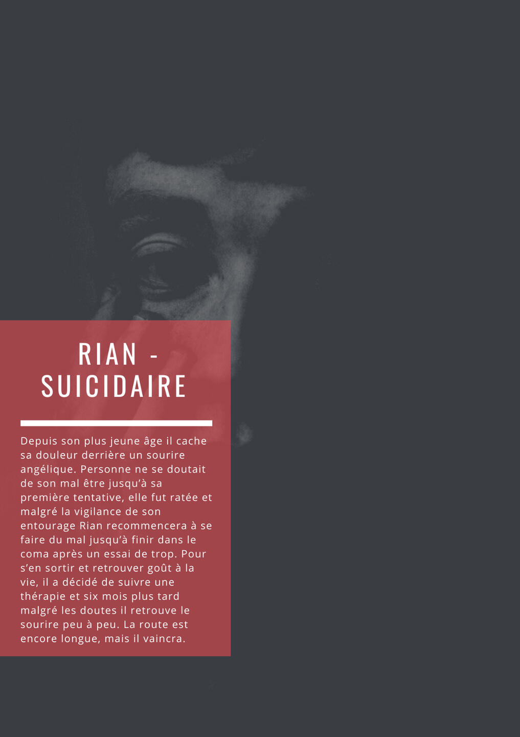 Puisque tout ça n’aurait jamais vu le jour sans l’aide de ma psychologue Sophia, merci pour tout, sans mes camarades qui ont accepté de se dévoiler devant mon objectifs et devant vous, vous êtes les plus forts. Je voudrais remercier ma meilleure amie, Ellire, qui pendant six mois est venue me voir chaque semaines sans exception, pour son soutien sans faille et son amour. Mes grands parents, même loin, je sais je vous êtes près de mon coeur. Mes amis, présents ce soir, qui m’ont encouragé à chaque étape de ce long chemin. Faith, qui n’est pas là ce soir, mais qui m’as soutenue autant que je l’ai soutenu à traversé cette grosse montagne commune. Papa, maman, c’est pour vous tout ça. J’espère que vous êtes fières.